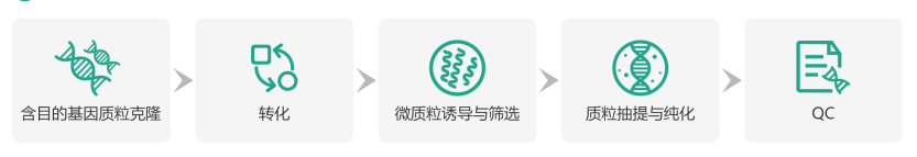 含目的基因質(zhì)??寺?→ 轉(zhuǎn)化→ 微質(zhì)粒誘導(dǎo)與篩選 → 質(zhì)粒抽提與純化 → QC
